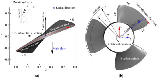 Figure 6 defines the blade chord coefficient λ, axial coefficient γ, and radial coefficient r*. The circumferential direction is the tangential direction corresponding to the circle of revolution and is perpendicular to the radial direction. The axial direction is aligned with the y-axis, as shown in Figure 2b. The chord coefficient is λ. The leading edge (LE) of the blade λ is 0, and the trailing edge (TE) λ is 1. The chordwise direction was from LE to TE. The main flow direction was from the pump inlet to the outlet. The radial coefficient r* = r/R, and the axial coefficient γ = y/R were defined, where r is the radius of any point of the blade, and R is the radius of the impeller chamber, with a size of 100 mm.