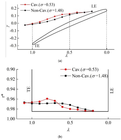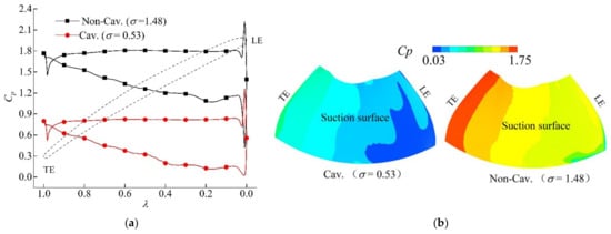 where is the static pressure. Figure 7a shows the pressure coefficient distribution curve, which was obtained by taking several groups of points along the radial direction of the blade pressure surface and suction surface to obtain the average pressure values. The pressure difference at the leading edge of the blade was large and gradually decreased along the chordwise direction. The pressure in the cavitating case was lower than that in the non-cavitating case. However, the distribution of the pressure difference in the two cases was relatively consistent. Figure 7b shows that the pressure on the suction surface of the leading edge was low and gradually increased along the chord. In the case of σ = 0.53, the pressure on the suction surface near the leading edge clearance reached the saturated vapor pressure required for cavitation.