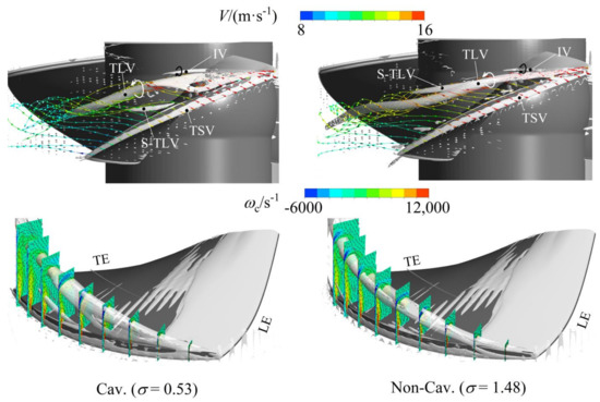 - Cavitation had an influence on the circumference velocity of the TLV center, and the vortex propagation velocity decreased. At the same time, cavitation inhibited the shear between the main and leakage flows, thus reducing the turbulent kinetic energy.