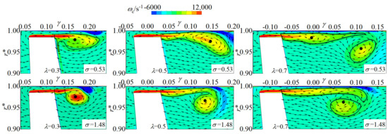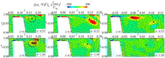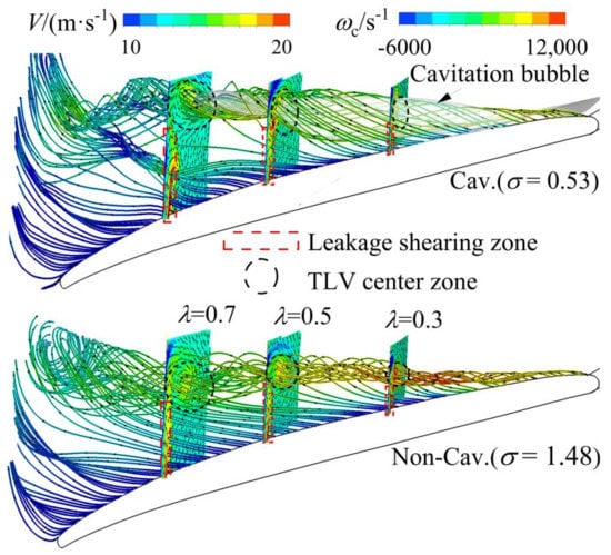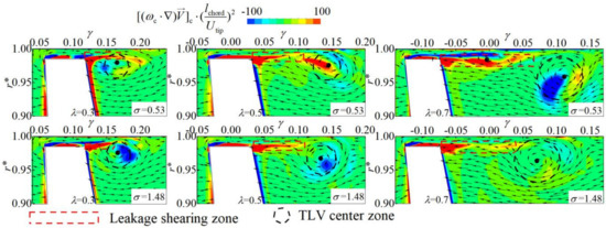 Figure 11 shows the distribution of vorticity ωc on the three planes (λ = 0.3, 0.5, and 0.7 sections). The vorticity was mainly concentrated in the leakage shear zone and the TLV center zone. The vorticity in the leakage shear zone was derived from the shearing formed by the convection of the leakage flow and the main flow. The leakage flow transported the vorticity to the TLV center zone, supplementing the vorticity there. Affected by cavitation, the vorticity was smaller than that of the non-cavitating case in the TLV center zone of the λ = 0.3 plane. The induced vortex formed in the endwall was entrapped in the periphery of the TLV center zone. The TLV vorticity of the non-cavitating case was relatively concentrated, so the induced vortices were slightly larger.
