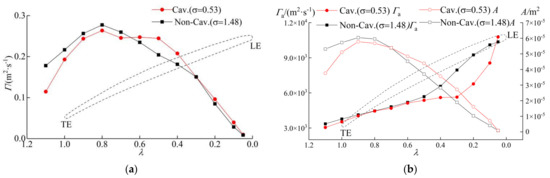 Comparison of the vortex strength and vortex area distribution for the cavitating case (σ = 0.53) and non-cavitating case (σ = 1.48). (a) Vortex strength Γ distribution curve; (b) Distribution curves of average vortex strength Γa and vortex area A.