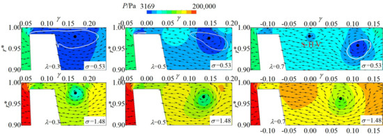 Figure 14 shows that the pressure of the σ = 0.53 case was lower than that of the σ = 1.48 case, and the pressure at the center of the vortex was the lowest. The white line in the figure represents the isovalue of the vapor volume fraction (αv = 0.1). In the case of σ = 0.53, a large-scale cavity appeared near the leading edge, which was consistent with the experiment results. After the cavity was formed, the vortex expanded and contracted in the radial and axial directions. The vortex structure changed from a circular shape to a spindle shape. The S-TLV vortex core center appeared at the λ = 0.7 section in the σ = 0.53 case, while it did not appear at the same position in the σ = 1.48 case. This was because the main vortex was far from the suction surface in the rear part of the blade, and the entrainment capacity was weak in the cavitating case. Therefore, the S-TLV had difficulty converging with the main vortex. Since there was no cavitation near the vortex center in the σ = 1.48 case, the entrainment capacity of the TLV was strong. Compared with the σ = 0.53 case, the TLV center was closer to the suction surface, so the secondary vortex was integrated with the main vortex.