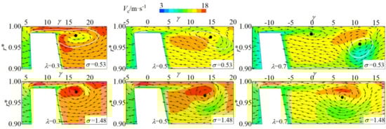 Figure 15 shows the circumferential velocity distribution of the TLV, which reflects the transmission capacity of the vortex. When the speed was low, the vortex tended to accumulate in one place, causing the vortex to develop in a radial direction. In the case of σ = 0.53, cavitation occurred in the TLV center zone, where the mixed vapor and liquid interacted with each other. The leakage flow could not easily form a uniform velocity, and Vc decreased due to the mutual shear between the fluids. In addition, the secondary vortex was separated from the main vortex, which also reduced the value of Vc.