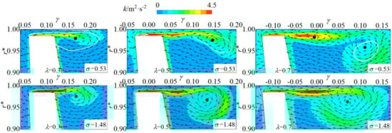 The TLV was generated by the mutual shear between the leakage flow and the main flow. This process was accompanied by the generation and development of turbulent kinetic energy k. As shown in Figure 16, when cavitation occurred, the cavity clusters occupied the position of the original leakage flow and the main flow convection, thereby inhibiting the formation of turbulent kinetic energy.