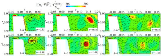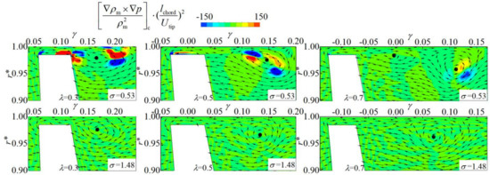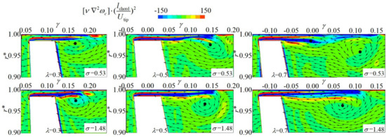 Cavitation changed the density distribution, leading to a change of the vortex baroclinic torque term. Figure 22 shows the distribution of the dimensionless baroclinic torque term. This term was largest in the TLV center zone, where vorticity generation and dissipation occurred simultaneously in the case of σ = 0.53. Since cavitation did not occur in the σ = 1.48 case, the value of this term was small.