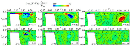 The change of the fluid volume will lead to an increase or decrease in the moment of inertia, which is accompanied by a change of the vorticity. When the volume increased, the vortex radius increased and the vorticity decreased, and vice versa. The dimensionless dilation term of the vortex center was basically negative, as shown in Figure 21, indicating that the volume expanded and the vorticity decreased. When affected by cavitation, the volume expansion was more significant. At the λ = 0.7 section, the cavity at the interface between water and vapor was extremely unstable, as shown in the dotted area. The cavity collapse caused the volume shrinkage and vorticity to increase.
