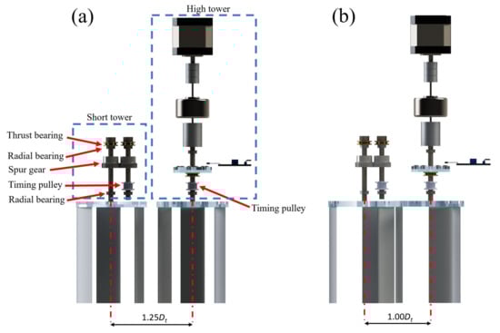 An illustration of the twin turbine apparatus variations: (a) counter-rotating and (b) overlapping turbines with the separation distance of and . The figure was adapted from [10].