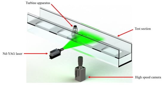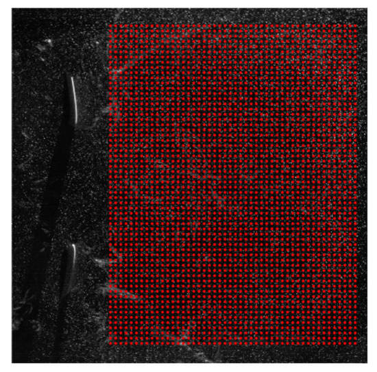 The PIV setup used to capture the twin turbine near-wakes is shown in Figure 2 for the reader’s convenience. The setup included a Photron FASTCAM SA3 camera and a 2 W 532 nm Nd-YAG laser which illuminated 90 m diameter Polyamide 12 seeding particles. The measurement plane was calibrated by a matrix of 29 by 29 white dots of 4 mm diameter and 6 mm spacing on a black background. The PIV calculation area was specified by 48 by 62 points spreading from 0.8 to 2.5 in the non-dimensonalized streamwise direction (x) and −1.15 to 1.15 in the non-dimensonalized channel wall normal direction (y). An example of the PIV calculation points on a raw picture can be seen in Figure 3. The uncertainty of this measurement technique was previously estimated to be within 5% in the streamwise direction and 2.5% in the transverse direction, of the freestream velocity [13,14,15].