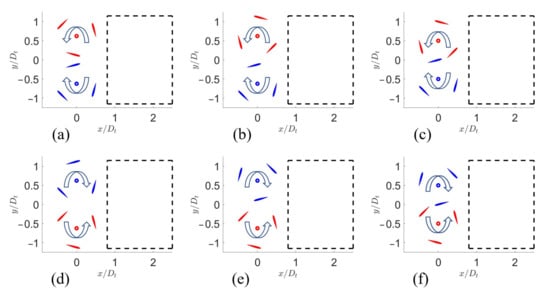 Different turbine configurations used in the near-wake measurement experiments: (a) forward counter-rotating at , (b) forward counter-rotating at , (c) forward overlapping at , (d) backward counter-rotating at , (e) backward counter-rotating at , and (f) backward overlapping at . The red and blue circles illustrate the turbine T1 and T2 rotational center correspondingly. The flow measurement areas are enclosed inside the black dashed lines.