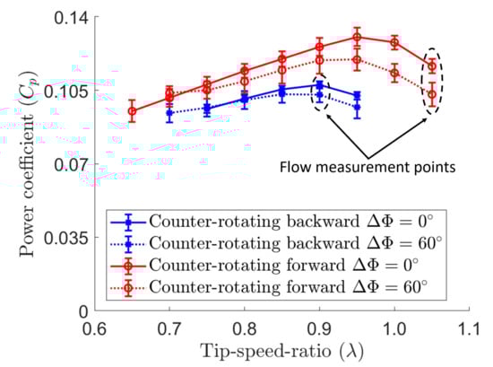 The power curves of counter-rotating and overlapping configurations at , which was adapted from [10], with the flow measurement points highlighted.