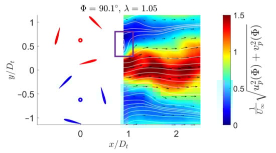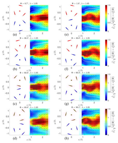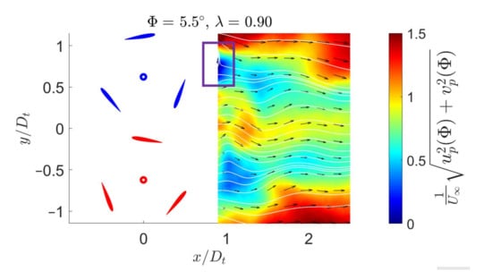 In terms of the forward counter-rotating configurations (Figure 4a,b), the phase difference was observed to break the symmetry of the near-wake. Figure 6 shows the flow structure of the two configurations at the tip-speed-ratio of 1.05 and approximately the same turbine angles. For the case of , the streamlines stayed relatively flat for the whole phase from to , except for Figure 6a and Figure 7, when two re-circulation zones were formed behind the turbines. On the other hand, obvious fluctuations of the flow can be seen in Figure 6e–h. Besides the fast flow zone in the middle oscillating up and down, the re-circulation zone behind the turbines also alternatively appeared in Figure 6f, behind turbine T2 in blue color, and in Figure 6h and Figure 8, behind turbine T1 in red color.