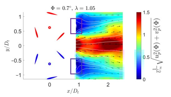 Regarding the backward counter-rotating and overlapping configurations, strongly skewed streamlines were observed for both cases at (Figure 13). Decreasing the distance between the turbines simply reduced the area of the slow zone in the wake. Re-circulating flows can be seen on all of the plots in Figure 13. These operating points were on the low power output side of the power curves, which suggested that turbine geometry should be designed to avoid re-circulation if possible.