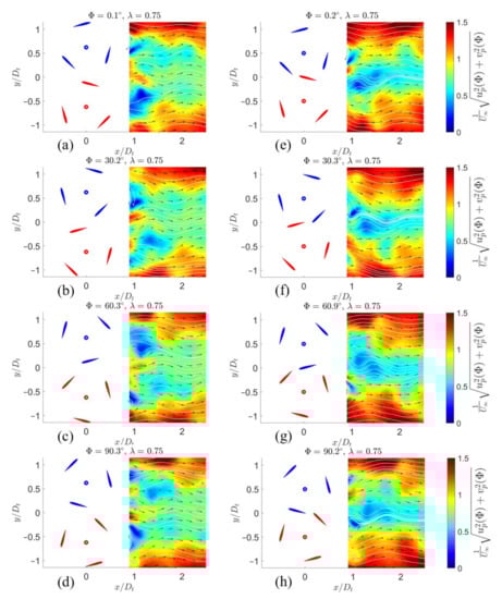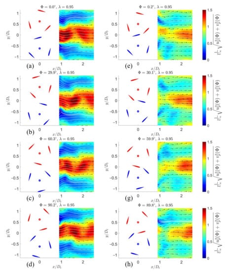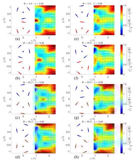 At the same phase difference of and different separation distances, moving the turbines closer to each other suppressed the fast flow zone, which was the source of kinetic energy loss (Figure 12). Furthermore, no re-circulation zone was observed for the forward overlapping case in Figure 12e–h, while part of a re-circulation zone was seen behind turbine T2, in blue color, in Figure 12a and behind turbine T1, in red color, in Figure 12d.