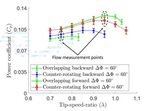 To observe the effect of the phase difference between the two turbines, the separation distance was fixed at and the flow structures were captured at 4 points shown in Figure 5. For the forward and backward configurations, the chosen experimental tip-speed-ratios were 1.05 and 0.90, respectively, as they exhibited clear difference in the power coefficient. The power coefficient and tip-speed-ratio are defined as