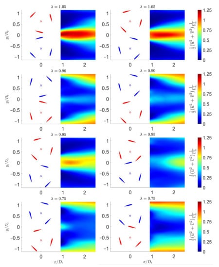 The qualitative observation of these counter-rotating configurations shows similar tendency as the observation of the single turbine configurations discussed in Part–I so the same hypothesis was expected. The less energetic flow field is observed behind the turbines, the more turbine power output is expected. Part–I suggested that the output energy could be evaluated by taking the average of the fluid kinetic energy over space and time. The time averaged kinetic energy of the cases shown in Figure 6, Figure 7, Figure 8, Figure 9, Figure 10, Figure 11, Figure 12 and Figure 13 can be seen in Figure 14. The recorded velocity fields were time-averaged as and and the non-dimensionalized time-averaged kinetic energy is defined as