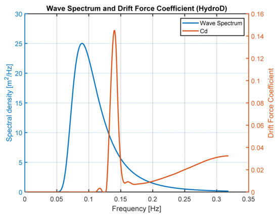 In order to understand the real contribution of the drift force, the drift force coefficient (Cd) is calculated using a panel diffraction program HydroD. Then, it is possible to integrate the total drift force in the sea state. The P-M spectrum, calculated with Equation (9), together with the drift force coefficient, are reported in Figure 2.