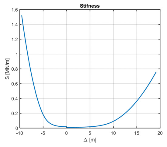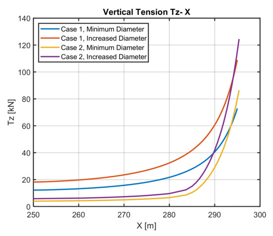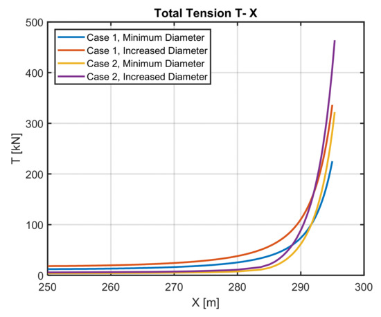 As seen in Table 17, a higher pre-tension would ensure a higher control on the platform’s horizontal displacement, but at the same time, the lines would be subjected to higher tensions. This happens because the length of the suspended line increases and consequently the gravity load generated from the lines, which characterize the catenary systems, also increases. It is also observed that incrementing the diameter and the weight of the cable, the length of the suspended line reduces together with the maximum tension of the mooring system. Moreover, the total distance from the anchor to the vessel reduces, but at the same time the horizontal excursion from the initial position (Xmean), due to mean loads, together with the maximum horizontal excursion (XC) increases. For this reason, an increment of diameter not always leads to a better configuration, not only because of the cost of the material and installation, but also particular attention should be given to the maximum offset limitations of the project under consideration.
