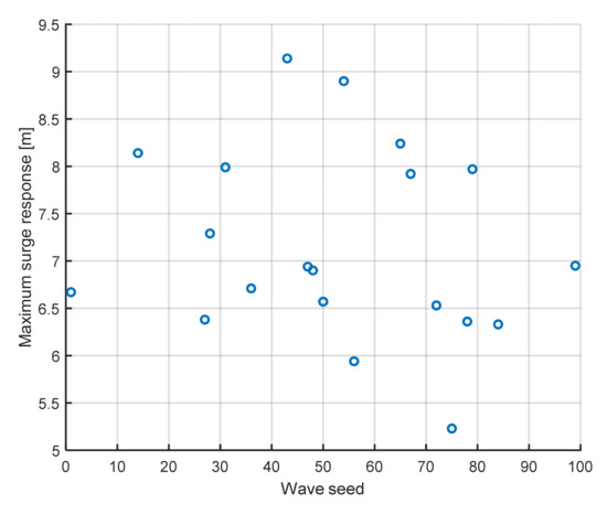 After validating the static analysis results, 20 time-domain dynamic analysis of 3-h are performed for each case. The results of maximum tension and surge motion amplitude, vary significantly with the seed number, as can be seen in the examples reported in Figure 20 and Figure 21. This proves that the system dynamic responses are sensitive to the wave train.