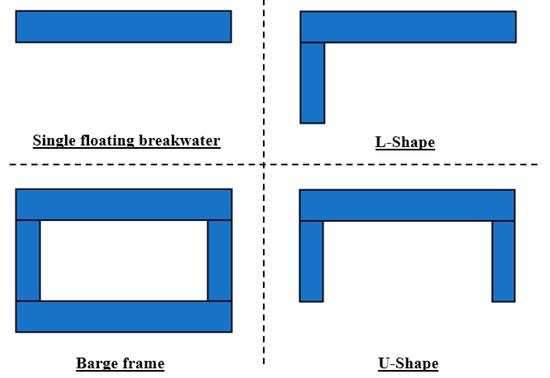 The three special configurations of floating breakwaters (L-shape, U-shape, and barge frame), together with the conventional floating breakwaters for comparison, are shown in Figure 1. As aforementioned, the barge frame is developed for the subsystem of the floating hydrocarbon storage facility. It consists of two identical longer barges and two identical shorter barges. The other configurations are simply defined by removing one to two barges.