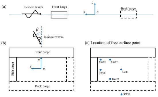 To describe the motions of the floating bodies, a global coordinate system oxyz is introduced as shown in Figure 2. The origin is located at the center of the free surface of the barge frame. The z-axis and x-axis are pointing upwards and perpendicular to the beam of the floating breakwater, respectively, with the y-axis determined by the right-hand rule. For ease of comparison, the global coordinate system remains the same for all other configurations in this paper. The definition of the incident wave angle β and the locations of free surface points, which will be used later in this paper, can also be found in Figure 2. For the case when two floating tanks are placed in the sheltered waters, the tanks are placed side-by-side in the sheltered water close to the breakwaters. The gap between the tanks and the front barge is 5 m, while the gap between the two tanks is about 11 m. Local coordinate systems are introduced when there are two floating tanks placed. The local coordinate system of the floating breakwaters overlaps with the global coordinate system. The origins of the local coordinate systems of the floating tanks are located at their corresponding center of the waterplane. The main particulars of the longer and shorter barges and floating tanks are listed in Table 1, and the corresponding mass properties are defined in Table 2. The center of gravity (COG) and radius of gyrations in the x, y, z direction (Rxx, Ryy, and Rzz) refer to the local coordinate system. The water depth for the present study is 18 m, which is representative of a coastal region around Singapore.