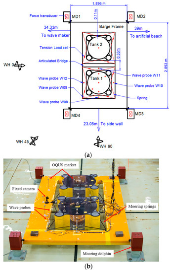 A series of model tests on the subsystem of floating hydrocarbon storage facility were completed in the Ocean Basin in SINTEF Ocean. The layout for the model tests and physical models of the subsystem are shown in Figure 5a,b, respectively. A Froude scaling factor of 1:45 was adopted for the model tests. Various loading conditions of the floating tanks and different environmental conditions in the coastal region of Singapore were tested. The 6 D.O.F motions of the floating barge frame and the floating tanks and free surface elevations in the narrow gaps were measured. Refer to [22,28] for more details on the model test setup.