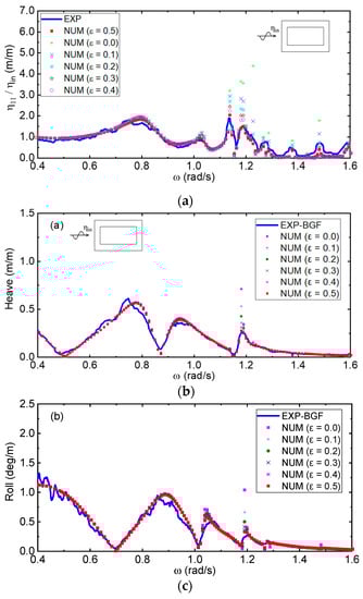 The model test results were used to validate the numerical models, and the validations were conducted for both the barge frame alone and the subsystem (barge frame and two floating tanks). The free surface elevations and the motions of the floating tanks and the barge frame were measured. Figure 6a–c show an example of the comparison between the numerical and experimental motion response amplitude operator (RAO) of the free surface and roll motion for the case of barge frame alone with different levels of dissipation factors. Note that the RAOs of free surface elevations are, in fact, the wave transmission factors for different wave frequencies, and a smaller RAO indicates a better performance of floating breakwater. The undamped numerical results overpredict the responses near the resonant frequencies, as expected. The numerical results using the dissipation factor ε = 0.5 show very good agreement with the experimental results for almost all the resonant modes. So, this value is adopted for further studies here.
