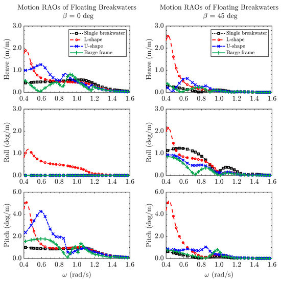 Figure 7 shows the motion RAOs of the floating breakwaters. When the incident waves are perpendicular to the floating breakwaters, all three configurations of floating breakwater have smaller motion than the conventional single-barge floating breakwater for wave frequencies higher than 1.0 rad/s. However, when rad/s, the L-shape and U-shape floating breakwater show much larger pitch motion, and roll motion are present for the L-shape floating breakwaters due to the unsymmetric shape. A similar trend can be found when the wave angle of incidence increases. Among these three configurations of the floating breakwaters, the barge frame has the best motion performance.
