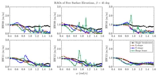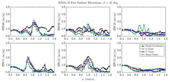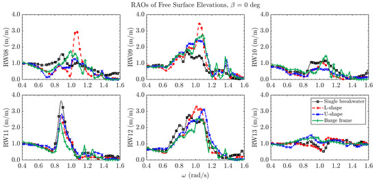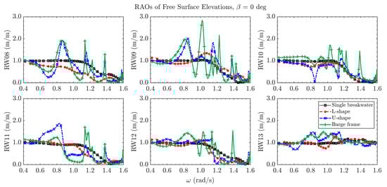 The RAOs of free surface elevations at the six locations in the free surface behind the sheltering barge are also reviewed, as shown in Figure 8 and Figure 9. It can be found that in the 0 deg incident wave direction, the single floating breakwater is effective when the wave frequency is higher than 1.1 rad/s. By changing the configuration to L-shape, the RAOs of free surface elevations reduce in a much broader wave frequency range than those of the conventional floating breakwater. Compared to the L-shape floating breakwater, the barge frame and U-shape floating breakwater tend to bring in a few resonant fluid motion modes, which lead to large RAOs of the free surface elevations at certain resonant frequencies. Apart from the resonant frequencies, the U-shape breakwater and the barge frame present better performance than the L-shape barges, especially in oblique seas where the resonant fluid motions significantly reduce. In general, the L-shape floating breakwater shows better performance than the conventional single-barge floating breakwater, while the performance of the other two configurations depends on the incident wave conditions. None of the configurations prove effective for wave frequencies ω < 0.4 rad/s (wave period T > 15.7 s), as the wavelengths are too long to be affected by the floating breakwater. Still, the limitation may not be too severe for relatively protected coastal waters where such long period swells may not be present with any significant amplitude. In deep water conditions where such waves may be more significant, additional measurements may be adopted to improve the performance of floating breakwaters, such as increasing the width of the floating breakwater. This is beyond the scope of the present study.