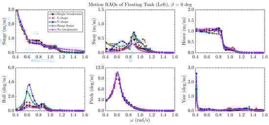 Motion RAOs of the left-hand-side floating tank with the different configurations of floating breakwaters in 0 deg incident wave direction.