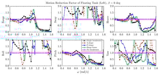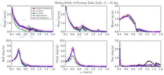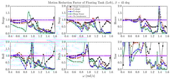 Figure 14 and Figure 15 show the effectiveness factor for the two floating tanks in the two incident wave directions. In the 0 deg wave direction, it can be found that the floating breakwaters can effectively reduce the surge and heave motion of the floating tanks, especially in the frequency range higher than 1.1 rad/s. The three special configurations of floating breakwater can effectively reduce pitch motion better than the conventional floating breakwater. In addition, the transverse motions (sway and roll) are strongly related to the existence of the floating breakwaters, which again indicates the importance of considering hydrodynamic interactions when evaluating the effectiveness of floating breakwaters. Note that the large in sway, roll, and yaw is mainly because of the very small RAOs when there is no breakwater. In the 45 deg wave direction, the barge frame shows better performance than the conventional floating breakwater and the other configurations, especially when rad/s.