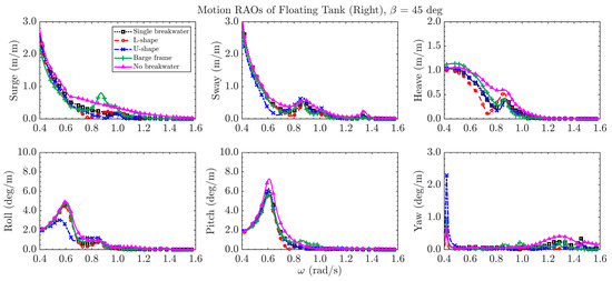 Figure 11 and Figure 12 show the motion RAOs of the left floating tank in 0 and 45 deg incident wave directions, and Figure 13 shows the motion RAOs of the right tank in 45 deg incident wave direction. The results of a case without the presence of any floating breakwaters are also presented for comparison. It can be found that the floating breakwater can effectively reduce the surge and heave RAOs of both floating tanks for both incident wave directions. The barge frame shows better effectiveness than the other configurations for rad/s, especially in 45 deg incident wave direction. However, it is noted that the floating tanks have larger motion RAOs in sway and roll in 0 deg incident wave direction with the existence of floating breakwaters. The sway RAOs can reach a similar level as those in the surge motion that is induced by incident waves.
