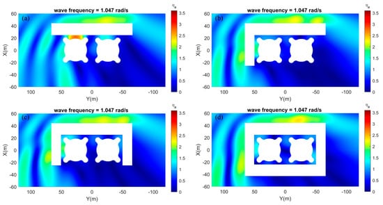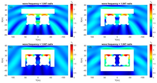 Amplitude of free surface elevations around the floating tanks and the breakwaters in 0 deg wave direction, with wave frequency of 1.047 rad/s for (a) conventional single floating breakwater, (b) L-shape, (c) U shape, and (d) barge frame.