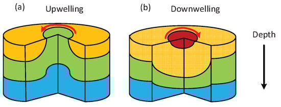 (a) Cyclonic eddy and (b) anticyclonic eddy three-dimensional schematic diagram. Shades of colour represent the water column temperature level, the red part has the highest temperature; by contrast the blue part has the lowest temperature, and the red arrow represents the direction of the eddy current in the northern hemisphere.