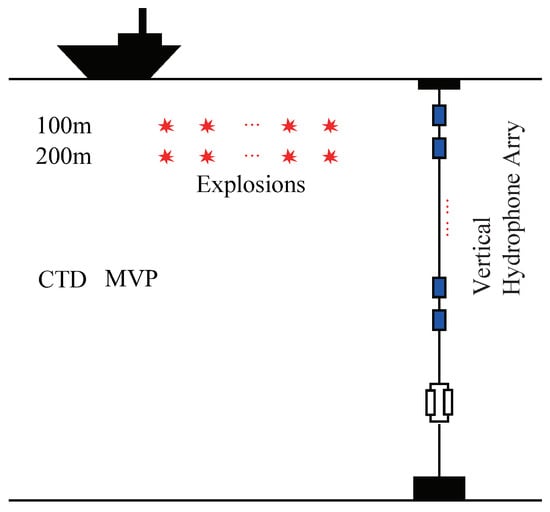 From May to July 2019, a joint acoustic propagation/mesoscale eddy physics experiment was carried out near the Kuroshio. The purposes of the experiment were to explore eddy hydrology structure and the influence of eddy on sound propagation. The expendable conductivity temperature depth (XCTD), conductivity temperature depth (CTD) and moving vessel profiler (MVP) were used to measure temperature and salinity in the ocean. Observational networks were extended to cover practically the entire mesoscale eddy area, a longitude from 148.5° E to 150.5° E and latitude from 33.65° N to 34.15° N. Receiver hydrophone line array coordinate is located at 150°30 E, 33°42 N. Moreover, the survey depth fluctuates obviously from 5900 to 6040 m. The surface sound speed approximately is 1520 m/s; the sound speed at the lowest channel axis position is 1484 m/s and increases to around 1547 m/s near the seabed. The equipment used for the experiment is shown in Figure 2 to track and measure the distribution of sound speed which lasted four days since 16 June 2019. Two types of explosives were selected whose explosion depth is 100 m and 200 m, respectively. The deep-sea sound propagation experiment was conducted by 1 kg explosions, dropped evenly spaced at the constant latitude and along the direction of longitude. The broadband explosive was occurring every 3 km, and the ship sailing within 3 h at a speed of 5 knots on the survey line. Inasmuch as the impact of ocean currents, two depth meters are hung on the vertical hydrophone line array to determine the position of each hydrophone in actual time.