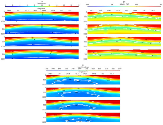 Measured data of (a) temperature, (b) salinity and (c) sound speed and each sub-figure from top to bottom was located at the latitude of 33.7°, 33.78°, 33.95° and 34.10° E.