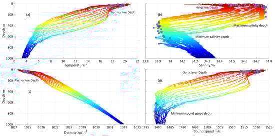 It is known from Figure 4 that the depths of the thermocline, halocline and pycnocline came close. The position of saltation is important for human submersible vehicle and marine animal in underwater navigation and action. Above those depths, oceans mix whereby winds, turbulence and currents, the temperature, salinity, density and sound speed differ greatly. Mesoscale eddy redistributes heat and brings carbon and other elements from one part of a body of water to another. Below those depths, the temperature and sound speed gradually decreased. Taking an eddy in the North Pacific as an example, in the section of 33.7° in latitude, the depth of the maximum salinity layer (34.68 psu) is located at about 70 m, and the depth of the minimum salinity layer (33.9 psu) is about 500 m. Sound speed approximate minimum at 1480 m/s, and the depth of the sound channel is nearly 800–1000 m. Judging from Figure 3, from the surface to 300 m depth, along the latitude of the section, temperature, salinity, density and speed of sound have a peak and two valleys. The peak value position is near 149.3° E that also represents the centre of the cyclonic eddy, while the valley value locations are near 148.7° E and 150.5° E. Moreover, the difference in temperature and sound speed between the cyclonic centre and the surroundings is much weightier than that of the salinity and density. The temperature and sound speed at the eddy centre (0–1000 m vertical integral) is greater than the surrounding values by about 0.97 C and 3.5 ms. While the salinity and density differences are about 0.05 psu and 0.14 kgm, respectively.