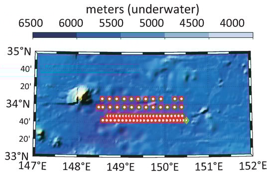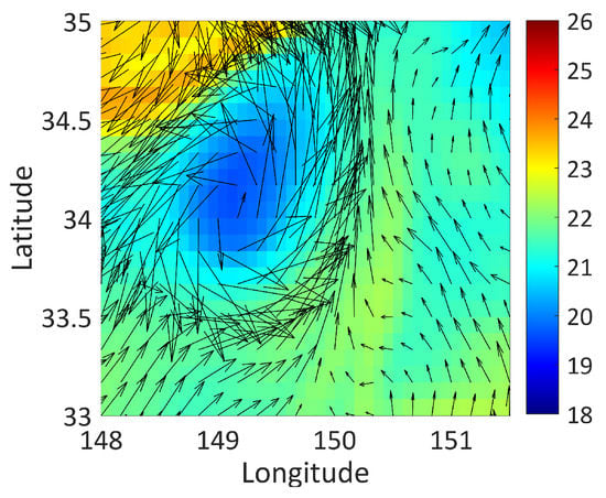 Satellite remote sensing data were obtained on the CMEMS website, and we tracked the position of the cyclonic eddy. The centre of the eddy moved westward by 18 min on the day of finishing the sound propagation experiment. The process of movement of the cyclonic was observed through sea surface height. The size, intensity and kinetic energy of the eddy increased at the early youth of the eddy’s life cycle; these characteristics remain stable in the later 3/5 of its adult period, and then rapidly decrease in the final old age of eddy’s life. As shown in Figure 5, the research area was from 148.5 to 151 east longitudes and from 33.5 to 34.5 north latitudes. The North Pacific cyclonic eddy moved westward over time and merged into Kuroshio after about three weeks. In Figure 6, the colour represents the satellite altimeters data and geostrophic velocity as the black arrow shows. Getting the information of marine and according to the sea surface temperature to determine the position of the eddy centre, we replan the acoustic propagation experiment, particularly the location of explosions. The scale of the tracked eddy is about 50 km. Combined with the distribution of hydrographic data, the eddy centre is predicted to be at 149.25° E and 34° N. Figure 7 shows the topography of the experimental area in the western North Pacific, the path of MVP300 (red dots) and the position of the vertical line array (green circle) on 18 June 2019.