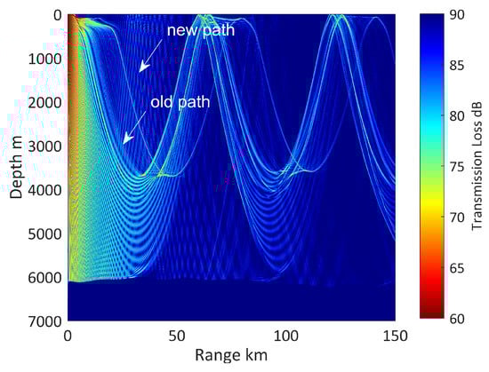 The whole depth of sound pressure transmission loss diagram is illustrated in Figure 8, and the simulated acoustic source was located in depths of 200 m. The sediment parameter is as follows: sound speed is 1650 m/s, density is 1.5 g cm, and the bottom attenuation coefficient is 0.5 dB/. The average depth of the ocean is 6137 m, which is approximately horizontal. Owing to the change of thermocline arising from cold-core eddy downwelling, surface sound channel (ranging from 0 m to 400 m in depth) is formed. New sound path markedly appears, as can be seen in Figure 8, marked as “new path”.