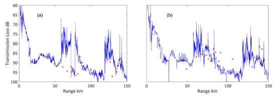 Transmission loss and experimental results in depths of 200 m (red asterisk), 100 m explosions (a) and 200 m explosions (b), and the blue line is simulated sound pressure transmission loss with a different range.