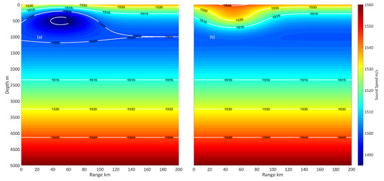 The analysis of effect of eddies on acoustic properties implied that the movement of the sound field converging zone is caused by the vertical gradient of the sound speed. Setting up the location of minimum sound speed profile as 1000 m, coefficient DC in Equatoin (3) is −25 m/s and 25 m/s for cyclonic and anticyclonic eddy, respectively. Furthermore, the semi-major axis of the Gaussian eddy model is 40 km, while the semi-minor axis is 400 m. Figure 11 shows sound speed contours of the cold core eddy and the warm core eddy. The bottom of the western North Pacific’s sound speed is 1650 m per second, and density is 1.5 g per cubic centimetre. The sediment parameters of deep water have little effect on the sound intensity in the distance. We select the parameters based on historical data in the Pacific. The parabolic equation method is applied to sound propagation problems to discuss how sound waves traverse eddies. The harmonic point source is located 200 m below the surface of the ocean. Subsequently, sound pressure redistribution is investigated.