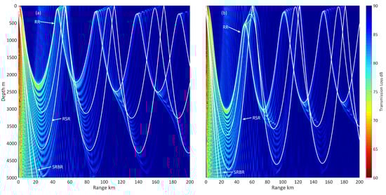 Figure 13 shows sound propagation through cyclonic eddy and anticyclonic eddy. To analyse the affection of ocean eddy on sound transmission, typical acoustic propagation paths are drawn by white curves. Among them, SRBR is surface reflected/bottom-reflected rays, RSR is refracted/surface-reflected rays, and RR is refracted/refracted rays. SRBR rays are closely linked to seafloor parameters and are valid for short ranges (<20 km). When the ocean is deeper than the critical depth, the remainder of the depth causes the formation of a convergence zone. Except for the SRBR rays, other types of rays are influenced by the critical depth. In addition, comparing these two pictures, the change of RSR rays caused by eddies is the greatest. At the location of the first converge zone, the depth of ray reversal changes dramatically. Near the sound source, those acoustic rays have a small grazing angle corresponding to the lower-order normal mode being excited. When it comes to the position of rays convergence in Figure 13a, the sound should be reversed at a small angle; however, reversal occurs at larger angles near the sea surface and vice versa. Instead of using the ray method, analysing from the normal mode perspective can get a similar conclusion. Figure 14 illustrates, on the one hand, the whole depth function (eigenfunction) moving up at the centre of the cold eddy and, on the other hand, the whole depth function (eigenfunction ) moving down at the centre of warm eddy. Indeed, the closer the receiver position gets to the centre of the eddy, the more violently the eigenfunction moves. Above all, with the process of sound propagation, the position of the seabed reversal points moves toward the source. Then, the rays reverse near the surface more quickly, which causes the position of the convergent area to move toward the source. As a consequence, the eigenfunction at the location of the convergence zone moves both upwards and forwards. Equally, with each order eigenfunction influenced by warm-core eddy, firstly, the position of seabed reverses downwards; secondly, surface reversals occur in a position further away; thirdly, the convergence zone keeps away from the source and to the surface.