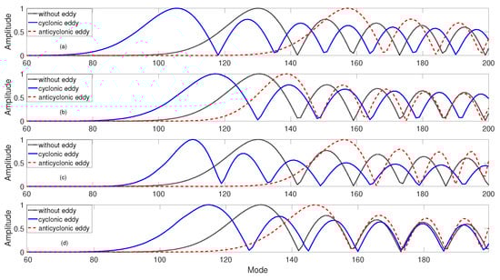 Normalised amplitude distribution of normal mode affected by real eddy at different positions from the sound source, which are (a) 10 km, (b) 50 km, (c) 90 km and (d) 150 km away from the source.