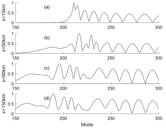 Normalised amplitude distribution of normal mode at different distances from the sound source, which are (a) 10 km, (b) 50 km, (c) 90 km and (d) 150 km away from the source.