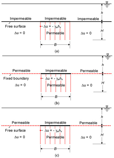 Three types of simulation schemes were implemented to examine the effects of consolidation and seepage on the soil settlement due to the existence of overlapping water in the process of underwater vacuum preloading. The top surface of soil domain was set as the impermeable boundary. Then a given suction (i.e., a suction head −hv corresponds to a negative pressure of Δu = −γwhv) was applied to each node along the vertical edges representing the drainage-allowable PVDs within the improved soil region. Following the foregoing set-up of numerical model, the consolidation was then allowed until no excess pore pressure existed in the entire soil domain. This is the first type of simulation scheme, namely suction-induced consolidation analysis (scheme I, see Figure 2a). Noted here, it is an idealized scenario, since the impermeable top surface aside the improved soil region was artificially implemented, aiming to avoid any seepage flow from the overlapping water into the improved soil zone involved in the analysis. Another one is suction-induced seepage analysis (scheme II) where the top surface of soil domain was restrained without any movement, and the drainage was permitted cross the surfaces asides the improved soil region (see Figure 2b). The third one is the analysis with the combination of suction-induced consolidation and seepage (scheme III, see Figure 2c). The only difference of the last two types of analyses is the elimination of constraint of the top surface as the free boundary again.