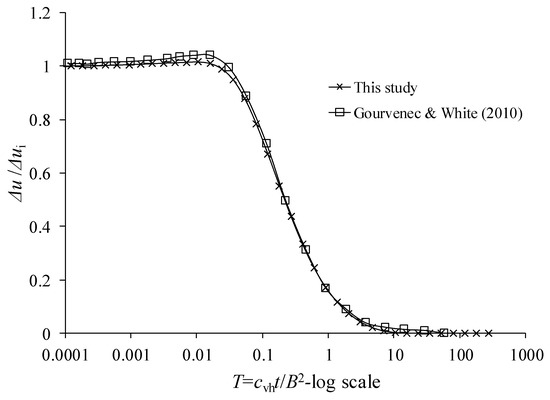 Following the study of [43] on the consolidation behavior of strip foundation subjected to a vertical surcharge load, the dissipation responses of excess pore pressure at the topsoil along the centreline were compared. Here, the finite element mesh strategy of this study was used, but the thin layer with the width of B on the top of improved soil was specified as rigid body without the application of suction head along the PVDs’ edges. As evident from Figure 3, a good agreement can be observed from normalized change in excess pore pressure Δu/Δui against elapsed time factor T = cvht/B2. Δu is the dissipated excess pore pressure with time, and Δui is the initial excess pore pressure. Therefore, the mesh technology and configuration of the numerical model reported in this paper can be validated to be used in the further drained analysis.