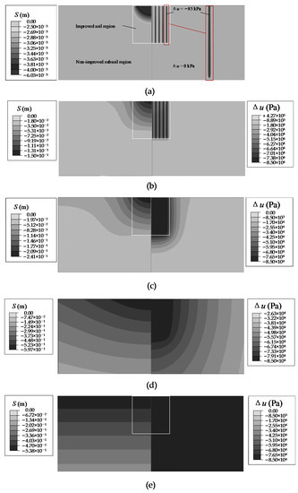 Figure 4 shows the evolution of settlement in response to the dissipation of excess pore pressure Δu during the process of suction-induced consolidation. Only the case of B/H = 1, −hv/H = −0.85, and kh/kv = 1 was demonstrated here, due to the similarity of evolution mechanism among the simulated cases. Five typical phases during the consolidation can be summarized: (i) onset of applying the specified suction head along the PVDs (T = 0, see Figure 4a). A series of discrete negative pressure regions shaped in ribbon pattern were generated, and the soil around PVDs slightly settled (Figure 4a). (ii) Transient phase with consolidation mainly occurring in the improved soil region (T = 0.002; see Figure 4b). The negative excess pore pressure was starting to expand mainly within the improved soil region, yet the settlement outside the improved soil zone occurred. (iii) Completion of consolidation in the improved soil region (T = 0.061; see Figure 4c). After the duration of consolidation of t = 1.94 × 108 s (corresponding to T = 0.061, around 6.15 years), the entire improved soil region showed a uniform negative Δu of −85 kPa, indicating the completion of consolidation within the improved soil region. It is consistent with the response of displacement (the legend S for the settlement) contour, where the soil settlement mainly occurred in the improved soil zone. The soil aside the improved region also performed the observable settlement, while the soil below the improved region performed the neglectable settlement. It is attributed to the difference in drainage path, shorter for the sideward soil, longer for the subsoil. (vi) Transient phase with ongoing consolidation mainly occurring in the non-improved soil region (T =5.273; see Figure 4d). The negative pore pressure was gradually expanding to far field, with the settlement aside and beneath the improved soil regions generated. (v) Completion of consolidation in the entire soil domain (T = 2738; see Figure 4e). With the continuous maintaining of suction head, Δu of −85 kPa propagated in the entire soil domain (t = 8.64 × 1012 s associated with T = 2738), reflecting the accomplishment of suction-induced consolidation. It resulted in a uniform settlement through the soil domain.