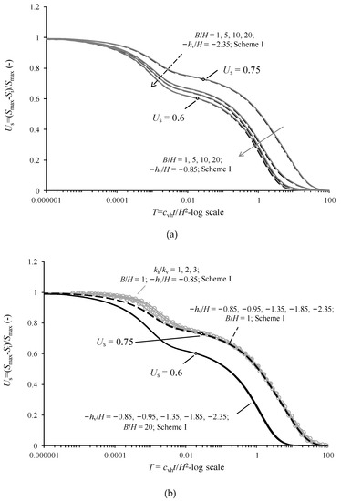To investigate the influences of B/H, −hv/H, and kh/kv on the settlement due to suction-induced consolidation, response of the normalized consolidation settlement (Us = (Smax − Si)/Smax) at the top surface and along the centreline of soil domain against the normalized elapsed time (T = cvht/H2) is reported in Figure 5a,b, where (1 − Us) is the consolidation degree in the formation of settlement, Si is the current consolidation settlement, and Smax is the final settlement after full consolidation. Four different B/H (of 1, 5, 10, and 20), five different −hv/H (of −0.85, −0.95, −1.35, −1.85, and −2.35), and three different kh/kv (of 1, 2 and 3) were included. The significant transition phase can be observed at Us of around 0.6 to 0.75 in all simulated cases. It is consistent with the evolution mechanism of settlement described above, where the settlement mainly occurred in the improved soil region at the early stage then in the subsoil, due to the difference in the length of drainage path. For identical B/H, the consolidation curves were almost coincident with varying −hv/H and kh/kv, implying no impact on them. As B/H increased, a faster rate of consolidation was found, with less discrepancy in larger B/H. It is reasonable since more PVDs can be employed in the case of larger B/H, resulting in the larger drain section and higher efficiency in drainage. It may imply that an efficient dimension for the improved soil region could be satisfied as B/H ≥ 5.