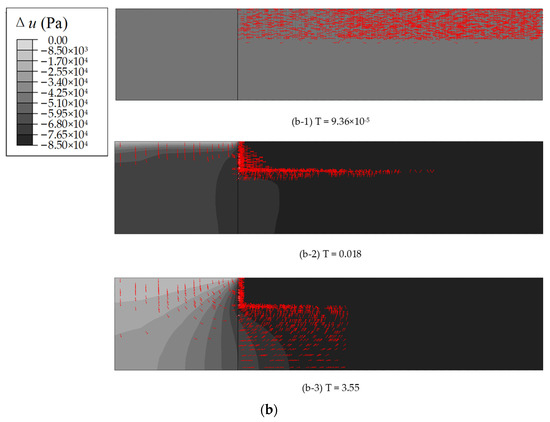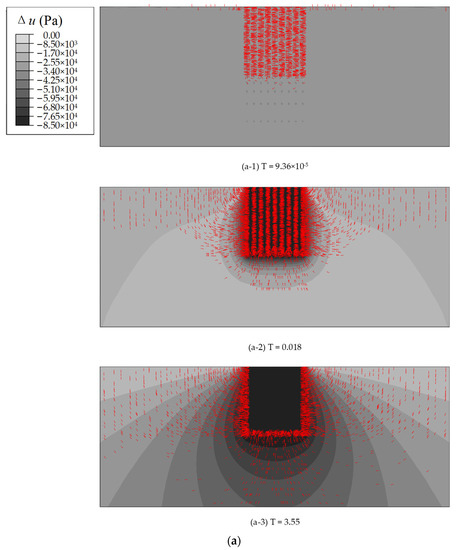 Figure 6a shows the development of suction-induced seepage with respect to the dissipation of excess pore pressure Δu for the case of B/H = 1, −hv/H = −0.85 and kh/kv = 1. The region extending a distance of to 2H horizontally and H vertically from the boundary of improved soil zone was selected, as the quantity of seepage flow into the improved region was of greatest practical interest. From the distribution of Δu at the very onset (t = 2.95 × 10−5 s corresponding to T = 9.36 × 10−5), as seen in Figure 6(a-1), a Δu of −85 kPa was generated as expected along the PVDs, resulting in the pore flow confined in the vicinity of PVDs along the horizontal direction. The seepage zones gradually extended to the unimproved soil part, as the suction head held. At t = 5.75 × 107 s (associated with T = 0.018), as shown in Figure 6(a-2), the different magnitude of head loss was observed through the soil domain, with the largest head loss (Δu = −85 kPa) occurring in the improved soil region, with the constant-head boundary (Δu = 0) slightly extending downward. It led to the obvious seepage flow from constant-head boundary to the improved soil zone. After a period of t = 1.12 × 1010 s (associated with T = 3.55), the steady-state seepage approached with the unchanged contour of Δu and distribution of flow velocity vector (see Figure 6(a-3)). Regarding the H × H zone aside the improved soil region, the seepage seemed to occur along a locus of quadrant. Regarding the bottom boundary of the improved soil region, the seepage inflow seemed to experience a longer path from the constant-head boundary.
