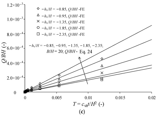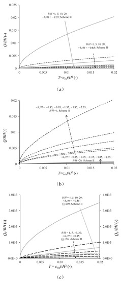 The normalized operative seepage discharge Q/BH with the elapsed time factor T = cvht/H2: (a) B/H; (b) −hv/H; (c) Ql/BH and Qb/BH.