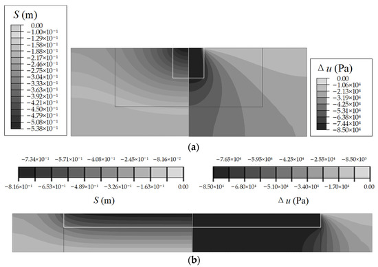 The response of settlement in the soil region of concern accompanied by the distribution of excess pore pressure Δu at T = 2738: (a) B/H = 1; (b) B/H = 20.